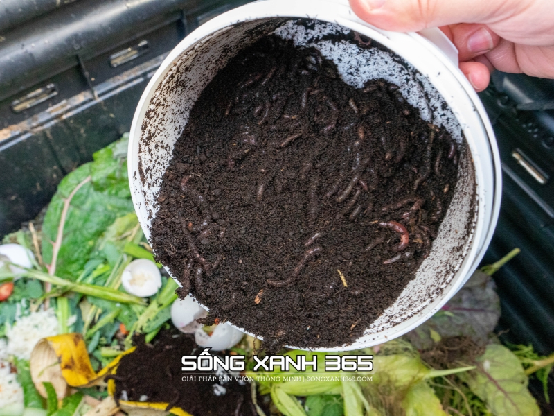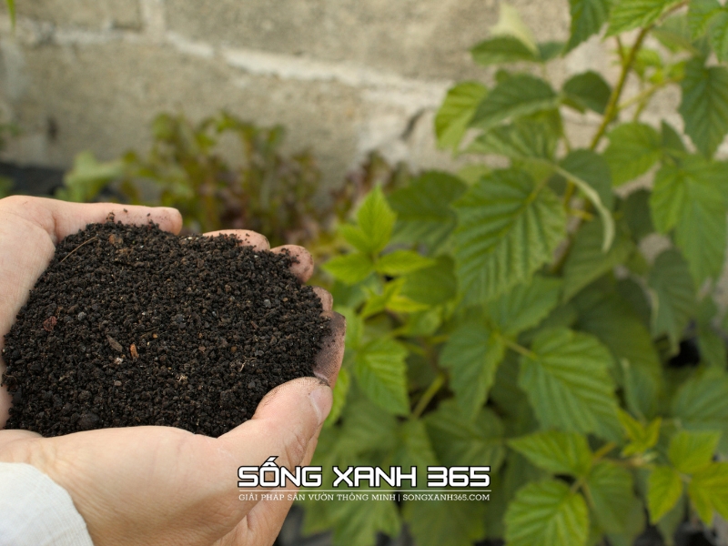 Sống Xanh 365 sử dụng loại phân trùn quế Mekong – tơi xốp, mịn, không mùi, giàu dinh dưỡng.